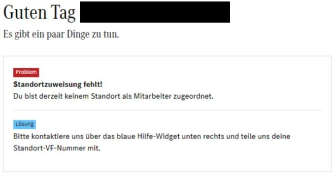 Diese Fehlermeldung erhalten Sie, wenn Sie in ALICE nicht korrekt einem Standort zugeordnet sind und somit auch keine Zuweisung im MK-Hub erfolgt ist.