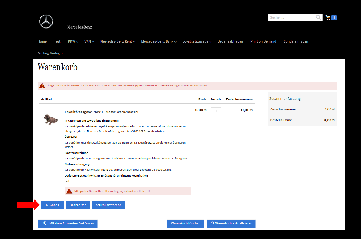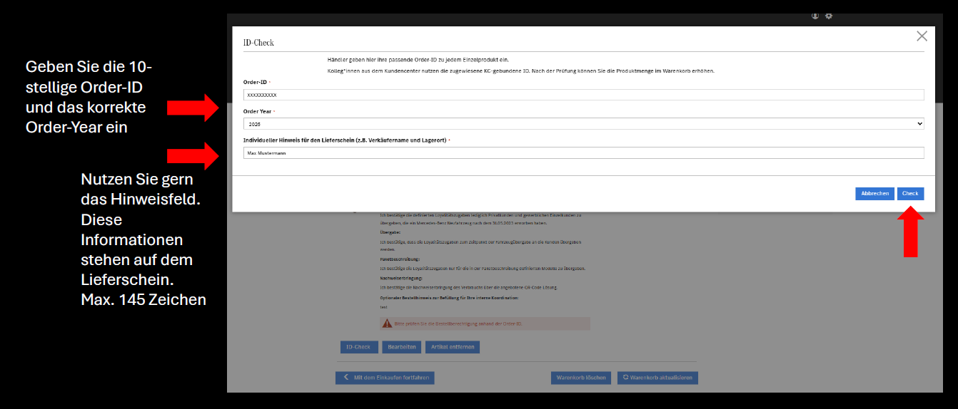 Bei der Bestellung der Loyalitätszugaben muss für jeden Artikel ein ID-Check durchgeführt werden. Hierfür muss eine gültige Order-ID (des Fahrzeuges) und Order Year im Warenkorb geprüft werden. Erst dann ist der Bestellabschluss möglich.